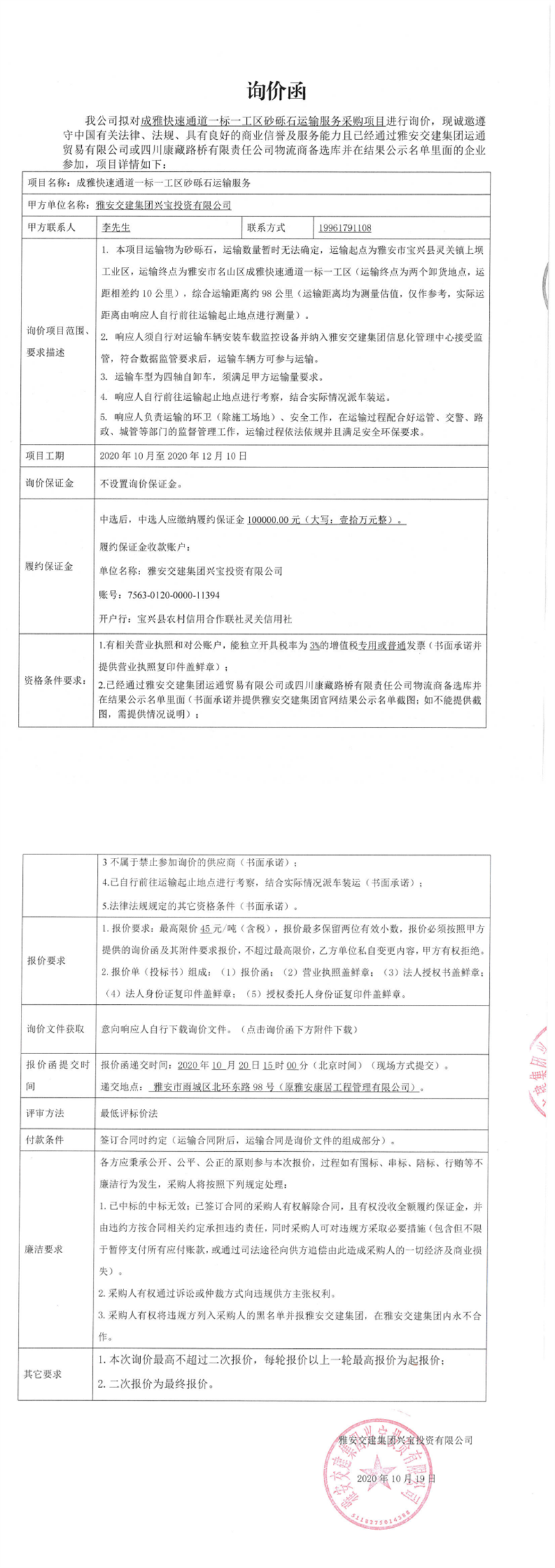 w66利来国际集团兴宝投资有限公司成雅快速通道一标一工区砂砾石运输服务采购项目询价函