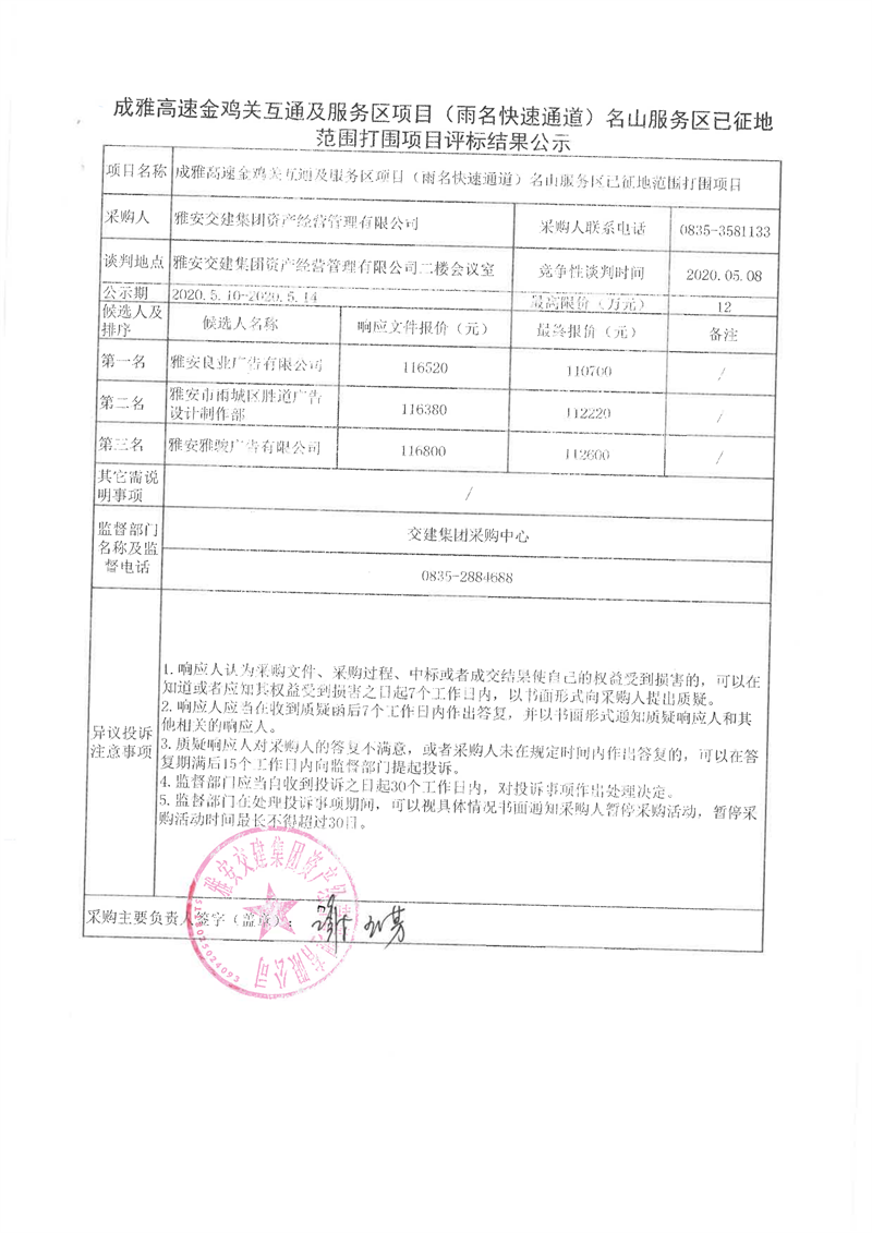 w66利来国际集团资产经营管理有限公司成雅高速金鸡关互通及服务区项目(雨名快速通道)名山服务区已征地范围打围项目评标结果公示