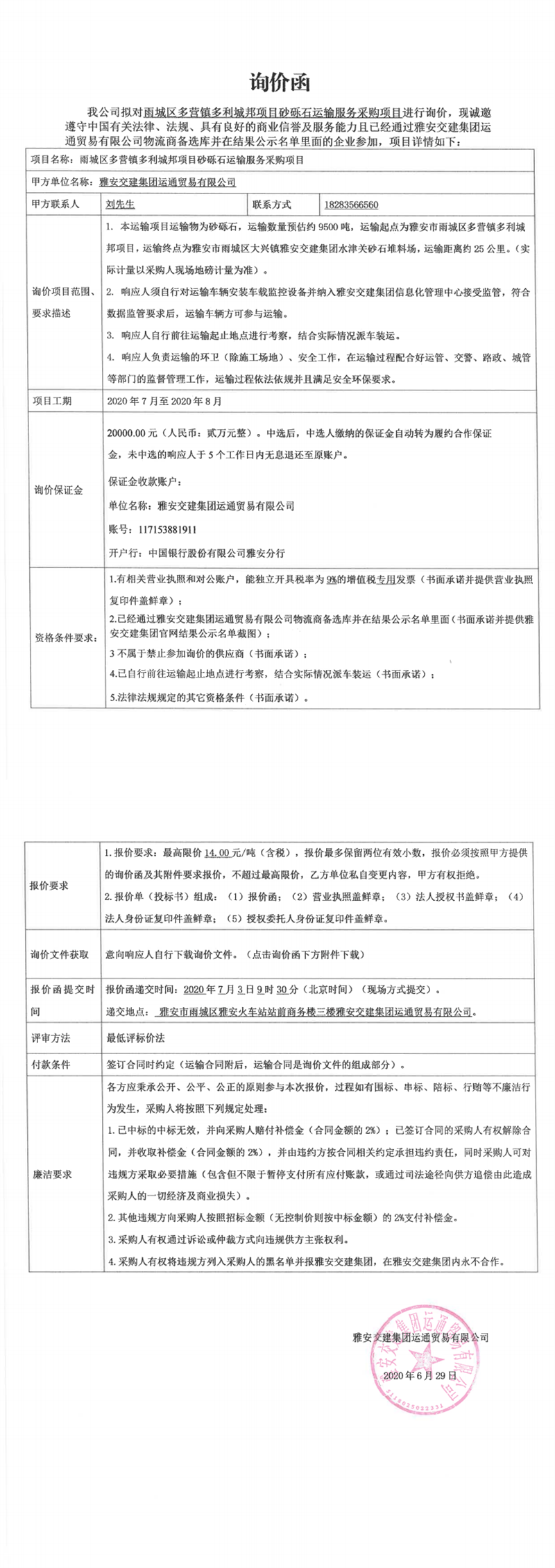 w66利来国际集团运通贸易有限公司雨城区多营镇多利城邦项目砂砾石运输服务采购项目询价函