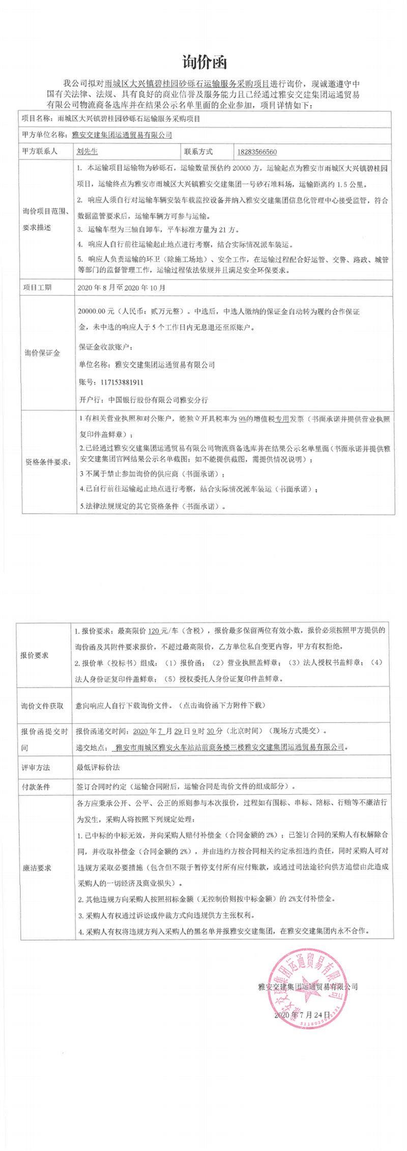 w66利来国际集团运通贸易有限公司雨城区大兴镇碧桂园砂砾石运输服务采购项目询价函