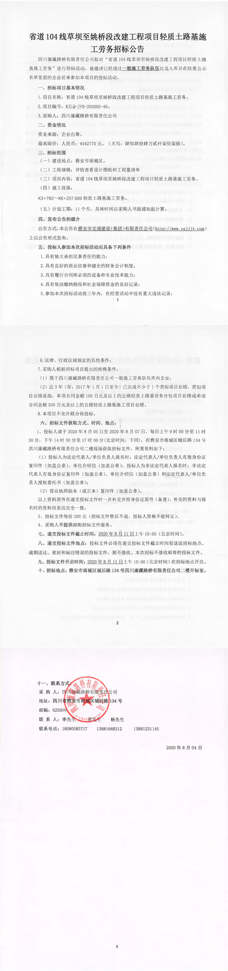 四川康藏路桥有限责任公司省道104线草坝至姚桥段改建工程项目轻质土路基施工劳务招标公告