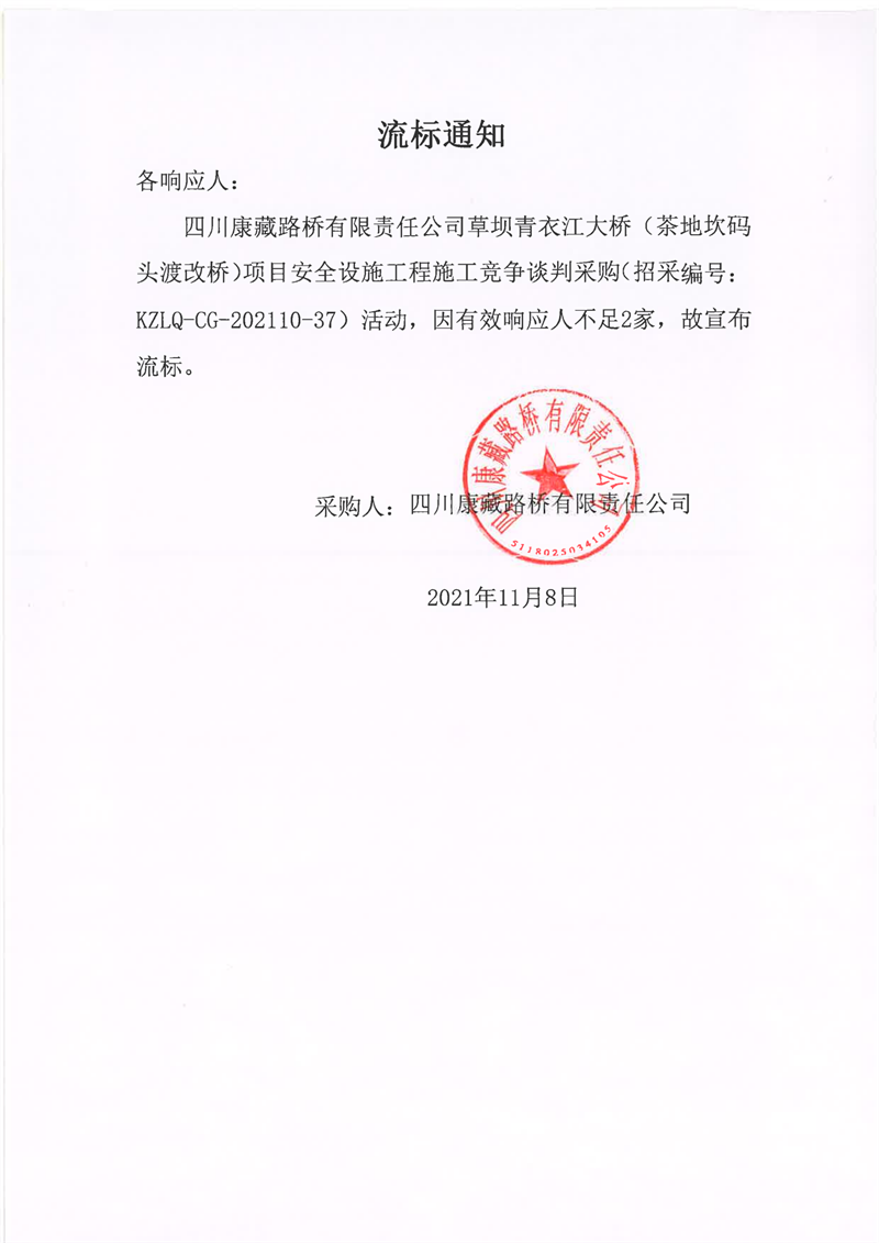 四川康藏路桥有限责任公司草坝青衣江大桥(茶地坎码头渡改桥)项目安全设施工程施工流标通知