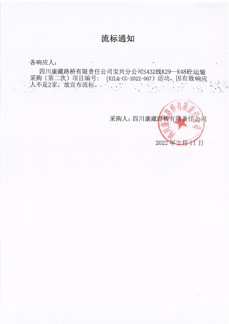 四川康藏路桥有限责任公司宝兴分公司S432线K29-K48砼运输采购(第二次)项目流标通知