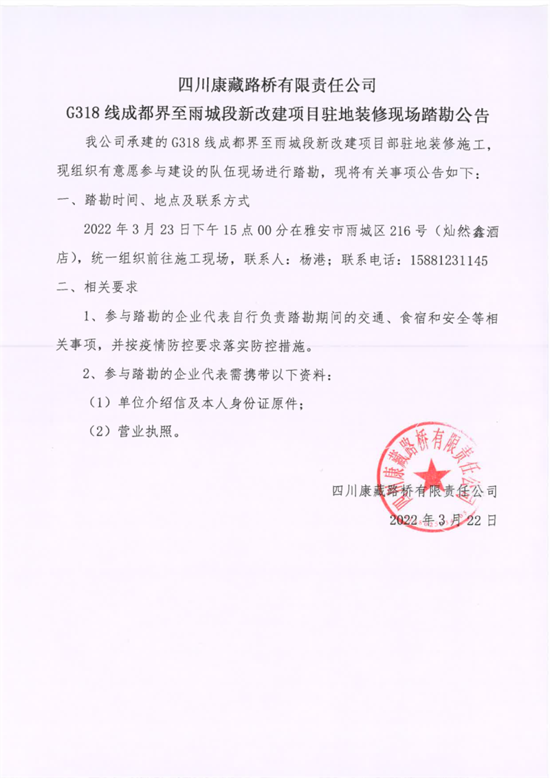 四川康藏路桥有限责任公司G318线成都界至雨城段新改建项目驻地装修现场踏勘公告