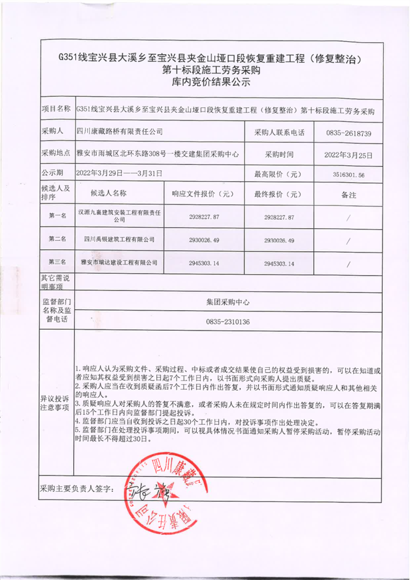 四川康藏路桥有限责任公司宝兴分公司G351线宝兴县大溪乡至宝兴县夹金山垭口段恢复重建工程(修复整治)第十标段施工劳务采购库内竞价结果公示