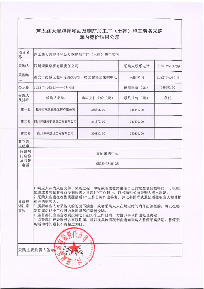 四川康藏路桥有限责任公司芦太路大岩腔拌和站及钢筋加工厂(土建)施工劳务采购库内竞价结果公示
