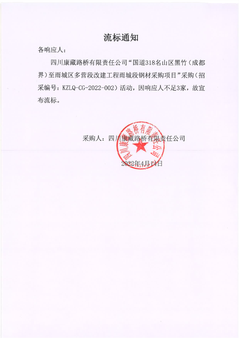 四川康藏路桥有限责任公司国道318名山区黑竹(成都界)至雨城区多营段改建工程雨城段钢材采购项目流标通知