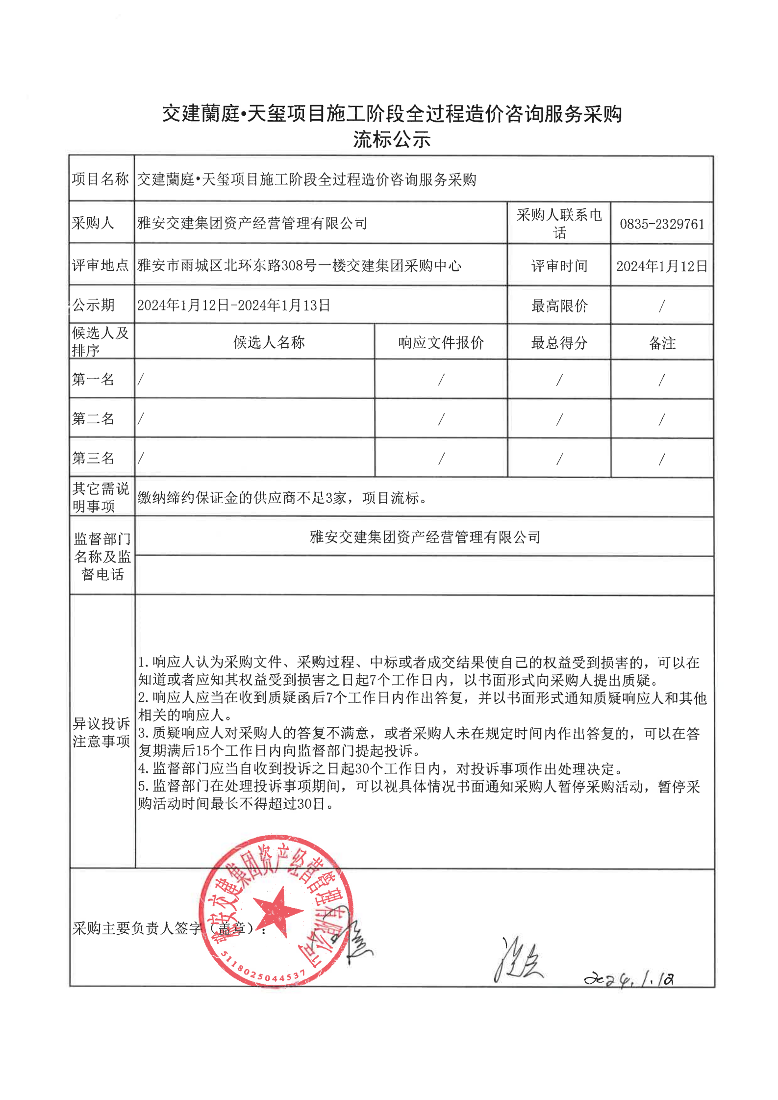 w66利来国际集团资产经营管理有限公司交建蘭庭·天玺项目施工阶段全过程造价咨询服务采购流标公示