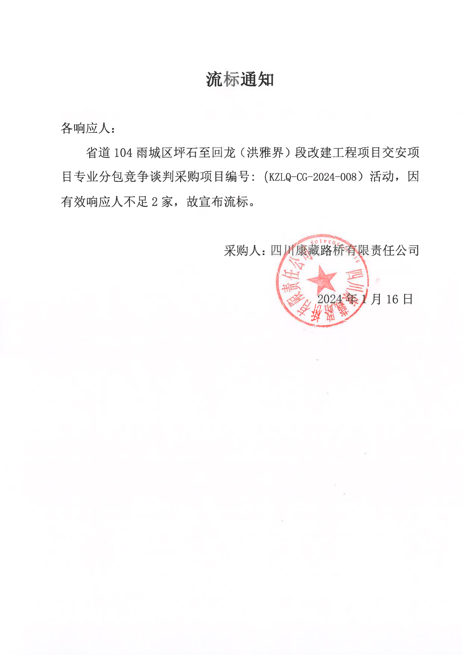 四川康藏路桥有限责任公司省道104雨城区坪石至回龙(洪雅界)段改建工程项目交安项目专业分包竞争谈判采购流标通知