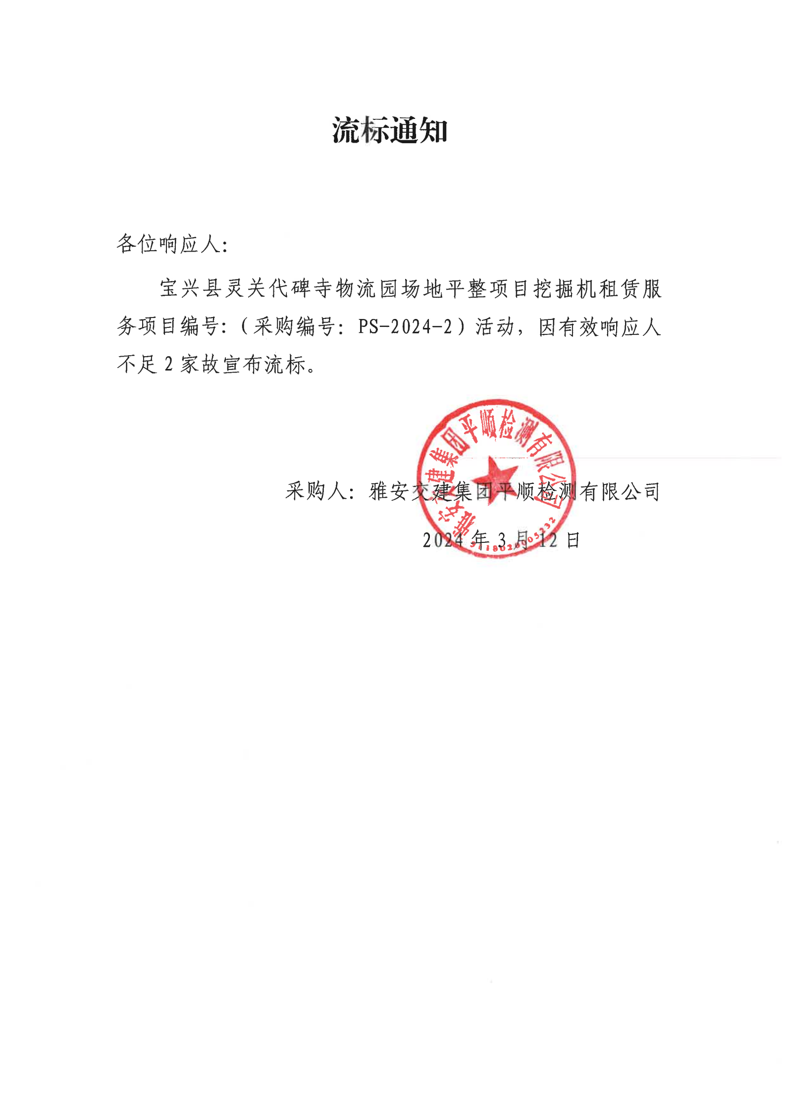 w66利来国际集团平顺检测有限公司宝兴县灵关代碑寺物流园场地平整项目挖掘机租赁服务流标通知