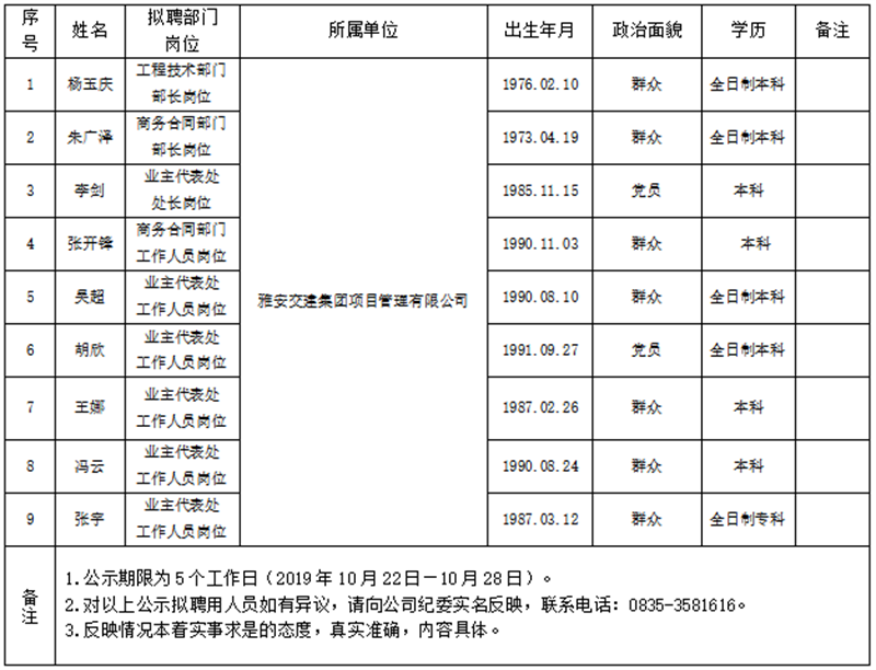 根据集团公司《人才选聘实施办法》,通过资格审查、综合测试、体检、考察等程序,对以下拟聘用人员予以公示: