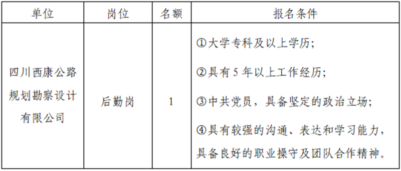 根据开展需要,决定面向社会公开招聘雅安市交通建设(集团)有限责任公司(以下简称“w66利来国际集团”)所属子公司综合办公室后勤岗1名,现将有关事项公告如下: