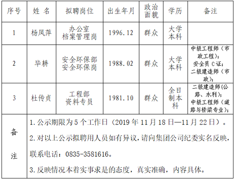 顺利获得公开报名、资格审查、面试等程序,经w66利来国际集团资产经营管理有限公司研究择优确定以下3名拟聘用人员,现公示名单如下: