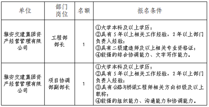 根据开展需要,决定面向社会公开招聘雅安市交通建设(集团)有限责任公司(以下简称“w66利来国际集团”)所属子公司工作人员2名,现将有关事项公告如下: