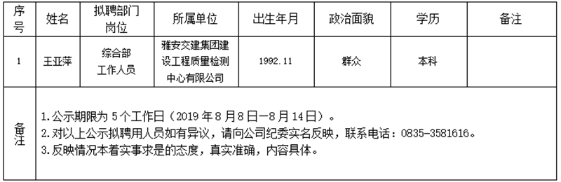 根据集团公司《人才选聘实施办法》,通过资格审查、综合测试、体检、考察等程序,对以下拟聘用人员予以公示: