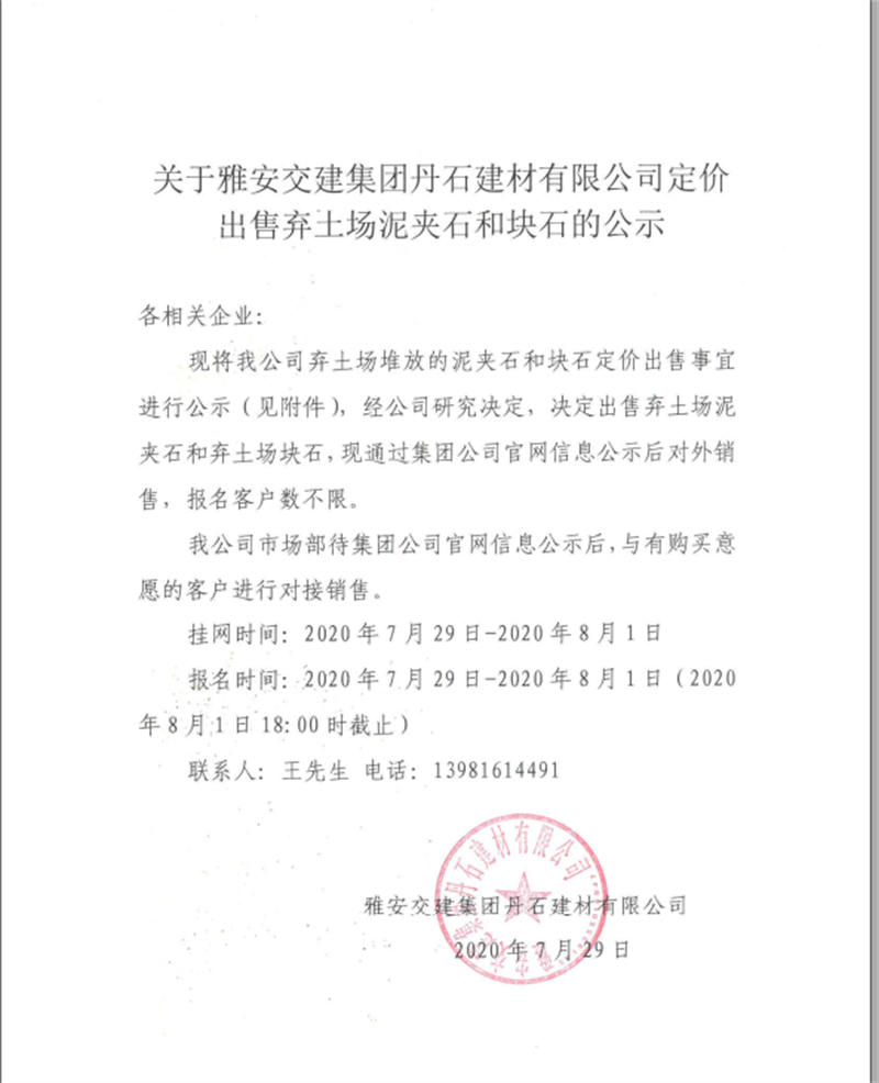 关于w66利来国际集团丹石建材有限公司定价出售弃土场泥夹石和块石的公示
