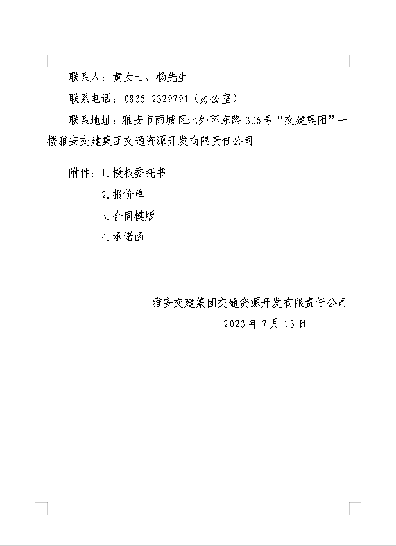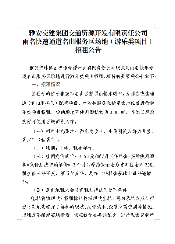 w66利来国际集团交通资源开发有限责任公司雨名快速通道名山服务区场地(游乐类项目)招租公告