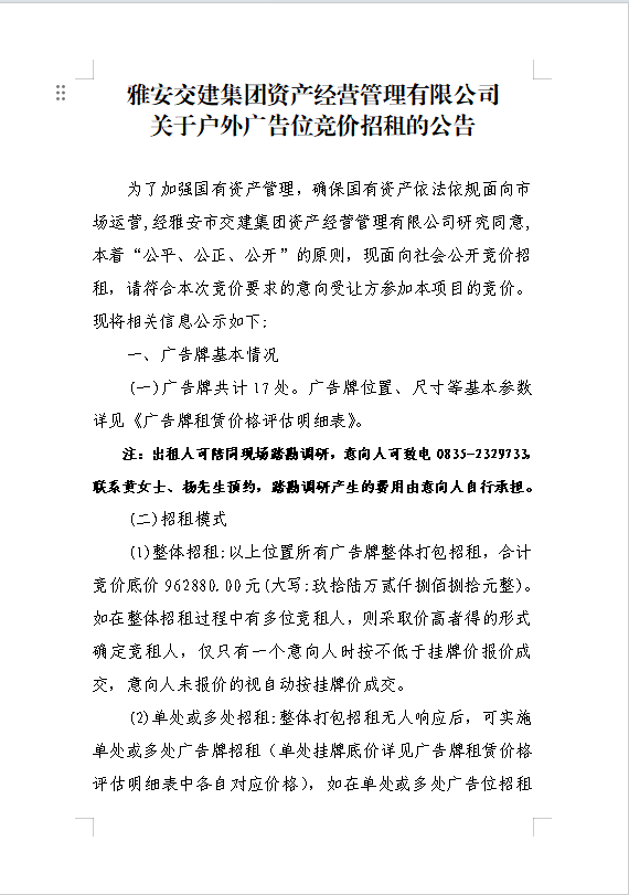 w66利来国际集团资产经营管理有限公司关于户外广告位竞价招租的公告