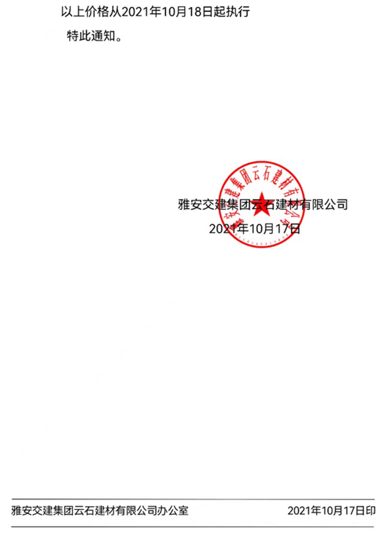 w66利来国际集团云石公司关于调整成品料销售价格的通知(2021.10.17)