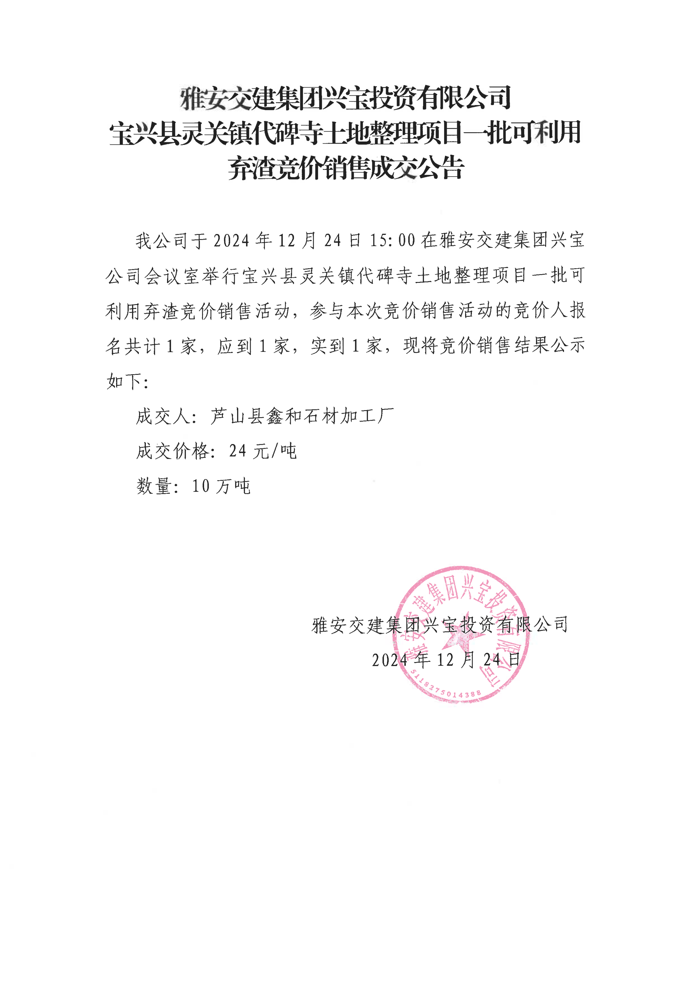 w66利来国际集团兴宝投资有限公司灵关镇代碑寺土地整理项目5万吨可利用弃渣成交公告(2024.12.24)