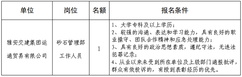 根据开展需要,决定面向社会公开招聘雅安市交通建设(集团)有限责任公司(以下简称“w66利来国际集团”)所属子公司工作人员1名,现将有关事项公告如下:
